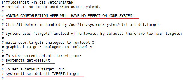 从配置文件内容可以看到,“在这里做任何的配置对系统都是没有作用的,systemd 用目标来取代运行级别。默认有两个主要的目标,multi-user.target 相当于运行级别 3,graphical.target 相当于运行级别 5。使用 systemctl get-default 来看当前使用目标,使用 systemctl set-default Target.target 来设置系统默认目标”。