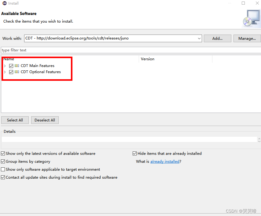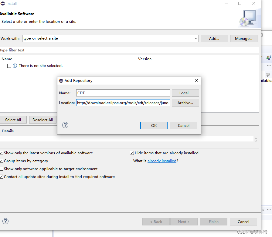 然后点击Add ,给定名称为:CDT,添加地址:http://download.eclipse.org/tools/cdt/releases/juno