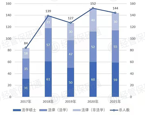 上海交通大学凯原法学院2021年总共录取了94名推免生,其中以法律硕士(法学)录取最多,总共录取了48人,法律硕士(非法学)录取12人,法学硕士录取34人。