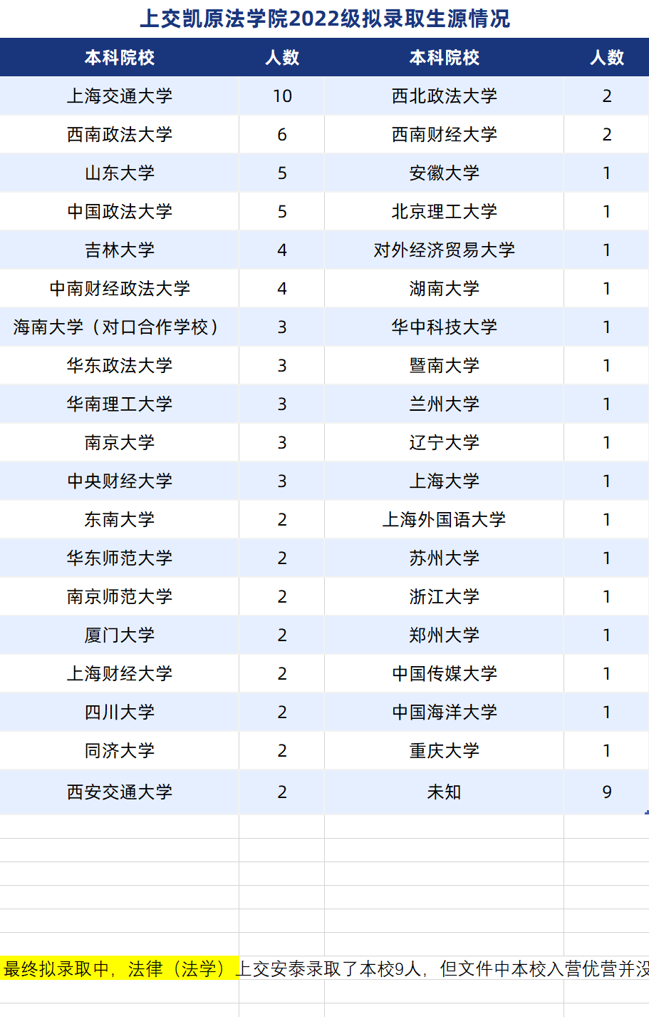本年上交凯原法学院录取生源院校达37所,录取较为多元化,其中录取人数较多的院校有上海交通大学、西南政法大学、山东大学和中国政法大学等,生源的录取较为偏向政法类的院校,其他院校的录取人数较为均匀。