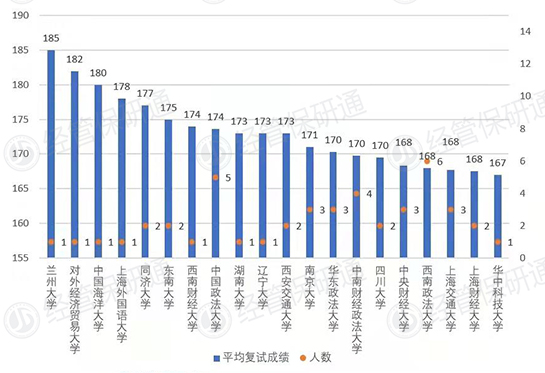 小通通过统计列示了录取均分在前20名的院校,上海交通大学的同学复试分数处于平均的水平,此外,录取均分最高分的是兰州大学的同学拿到185分,同时对外经济贸易大学、中国海洋大学、上海财经大学、同济大学等高校的同学同样表现出色。