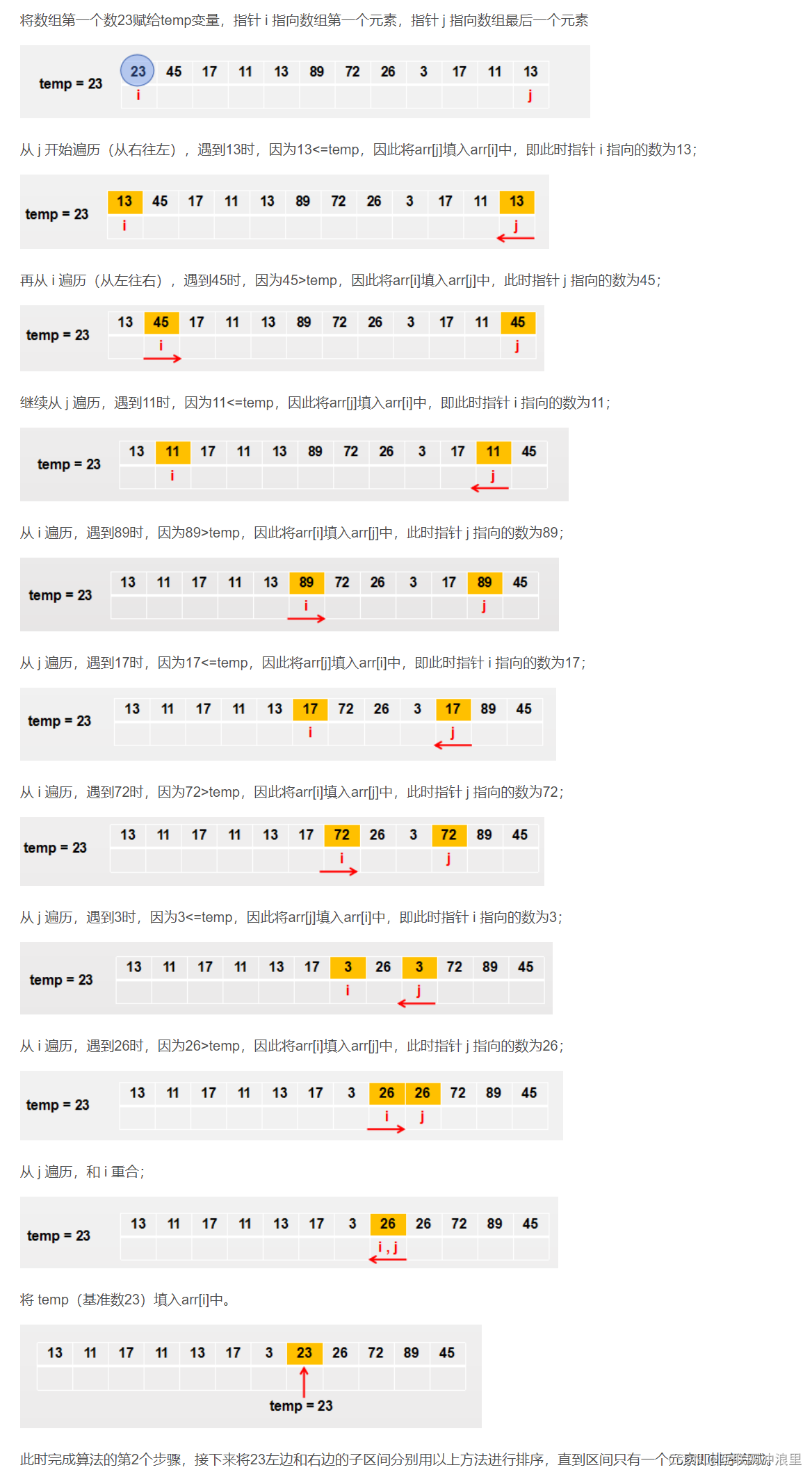 如下例:给序列arr={23,45,17,11,13,89,72,26,3,17,11,13}进行一趟快排,基准数用temp记录(初始选择第一个元素)