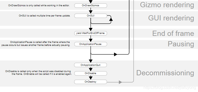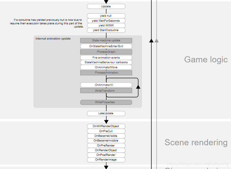 Update 更新:脚本启用后,每次渲染场景是调用,频率与设备性能及渲染量有关。