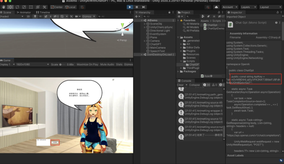在项目中可以找到 AIDemo.unity 场景,直接填入获取到的 ChatGPT API Key,便能直接运行调试预览。
