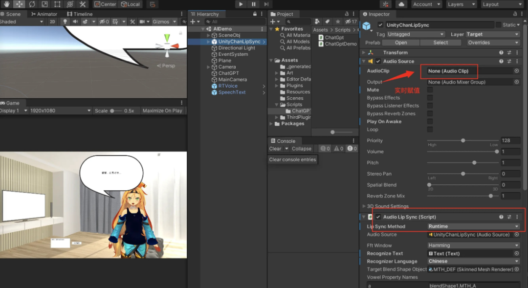 操作步骤二后,获取到音频 Clip,就把音频 Clip 实时传给 SyncLip 插件 SDK,从而让 Unity Chan 获取到 ChatGPT 信息后在虚拟世界中拥有相应的嘴部“形”态。