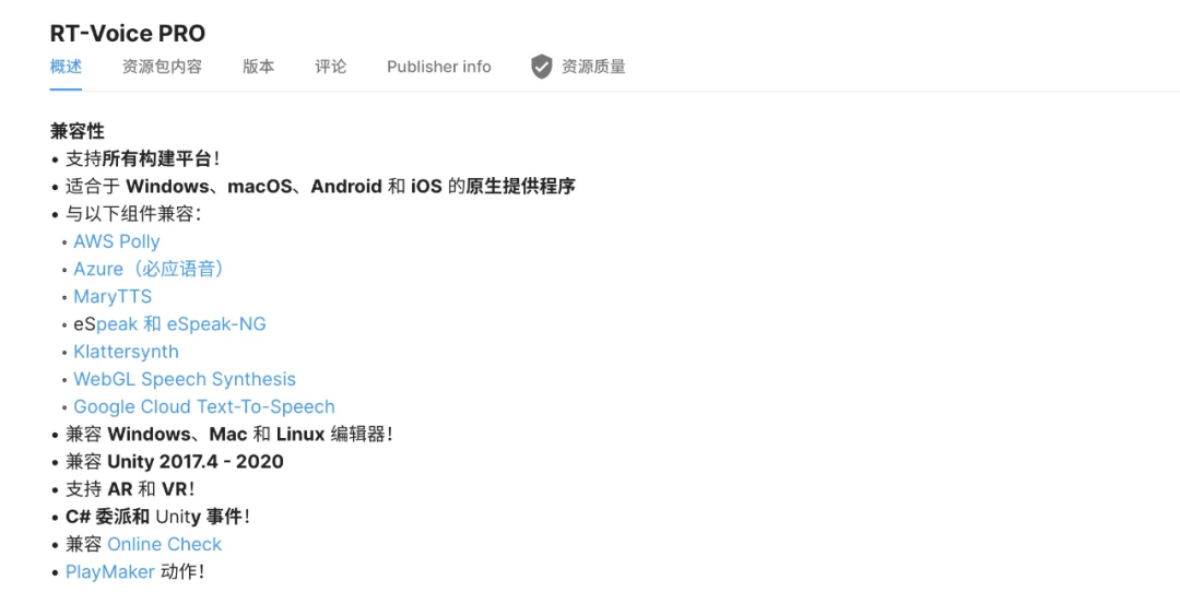 为了实现文本转语音,作者专门调研了一些常用的 TTS 技术方案,最终选定 RT-Voice PRO Unity 插件,它支持所有平台,支持中文,其中包含实际的案例,应用起来也简单便捷。作者还关键做了一步处理,把获取的文本信息实时传给 RT-Voice SDK。