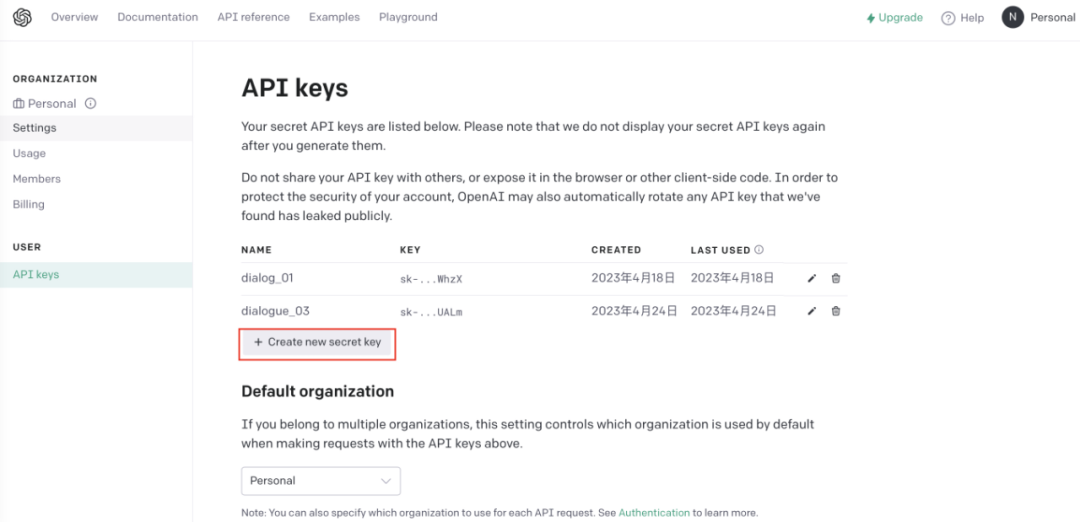 1.2 ChatGPT 提供了开放接口,通过个人版账号的 API Key 接入 ChatGPT,API Key 获取入口(本项目测试模型 GPT-3.5):
