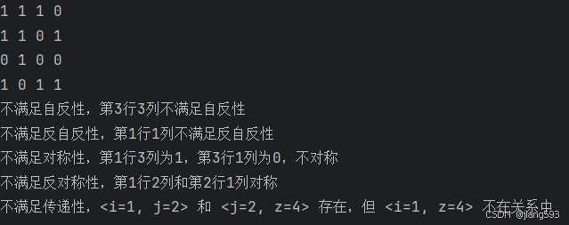 print(f"不满足传递性,<i={i+1}, j={j+1}> 和 <j={j+1}, z={z+1}> 存在,但 <i={i+1}, z={z+1}> 不在关系中")