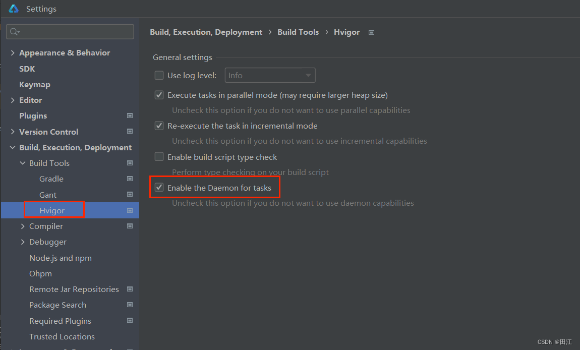 file---->settings-->build,Execution,Deployment--->build Tools----->Hvigor 勾选最后一项:Enable the Daemon fo tasks