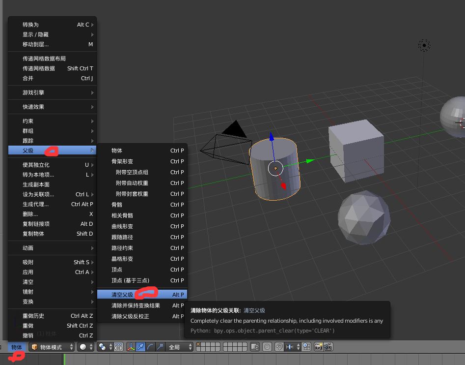 选中一个或多个物体,按【Alt + P 】键 可解除父子关系