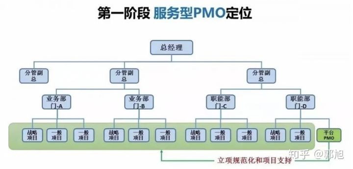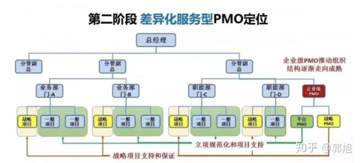 接下来,如果我们PMO第一步阶段过去了,已经能够得到大家的认可,认可是你挂在某一个强势分管副总下面,服务大家这件事得到认可了,接下来可以考虑走第二步了。第二步是做什么呢?就像上面这张图看的一样,在这个时候我们要做的一件事情,我们把PMO的地位提升一下。在第一阶段其实我们是把PMO放在了分管副总下面的职能部门的底下,我们都没有放到分管副总下面,因为主要怕被职能部门给灭了,刚开始初期的时候要低调。但是第二阶段当我们这个PMO管理已经有了一定成熟度,人员有了一定能力的时候第二步可以考虑做的一件事可以往上升一级,这时候PMO可以直接挂到分管副总下面,这个时候跟分管副总下面职能部门平级了,而且大家可以考虑把我们的PMO分化两类,一类是属于战略类PMO,一类叫平台类的PMO。战略类的PMO,为什么要这么分呢?其实主要我们要把企业内的项目,这时候项目全都挂在各个业务部门跟职能部门底下了,大家记住初期的时候一定不能把项目挂在PMO底下,要不PMO的责任就大了。因为项目挂谁底下谁负责,如果项目挂在业务跟职能部门领导底下,如果项目失败了,他们主要负责。如果这个项目挂PMO底下,项目失败了由PMO负责。如果PMO既要对项目的成败负责,手上有没有资源和权利的时候,这事会非常难受。所以初期的时候前几个阶段大家都不要考虑把项目挂在PMO底下,所以在第二个阶段的时候我们仍然让项目挂在业务部门和职能部门底下的,因为他们有权利和资源的。但是我们希望干一件什么事呢?把他们想要的项目分成两类,一类叫战略项目,一类叫一般项目;或者一类叫重点项目,一类叫普通项目。分类的目的是为了对这些项目提供差异化的服务。这时候PMO也可以分成两拨人,一拨人是进行战略项目的支持,另外一拨人进行普通项目的支持。这个时候我们会发现对战略项目进行支持的这拨人必然更深入地进行支持,这是通常我们说的支持跟保证加上,保证加上的概念其实里面要开始融入一些少许监督的角色。这是第二阶段把项目分级,同时提供差异化的服务和保证。因为对战略项目提供保证这件事顺理成章,为什么?因为战略项目一定是公司内老大一把手关心的事,所以这件事你找他要信息,我给老大做汇报,这件事通常一般比较能接受。