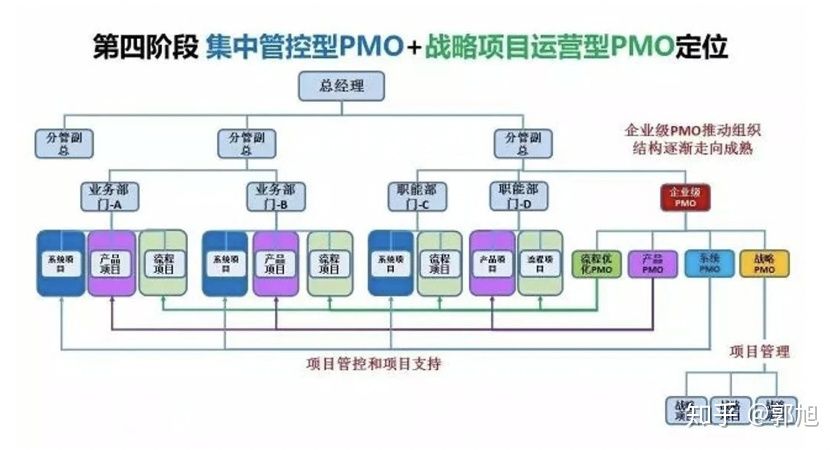 当第三个阶段的工作能实现之后,我们可以开始考虑第四个阶段。第四个阶段我们叫做集中管控型PMO,如果前期的时候我们对各部门的PMO的工作已经扶持的足够好了,而且这种项目管理的规范性已经提升了之后,这个时候其实我们可以考虑下一步,下一步要做的是什么呢?把这个企业级的PMO进行分类管理,这个时候我们会产生不同类别的分子PMO,就是在这个企业PMO中,比如有的是专门管IT的,有的专门管产品的,有的可能专门管市场的,有可得专门管流程优化或者管理提升的。在第四阶段的时候大家其实重点要解决的问题得首先能够把企业内的分类工作做好,而且要去强化的是项目管理必须要进行分类的项目管理,只要项目管理一进行分类项目管理的时候,分类项目管理的专业性肯定会更强,PMO更容易借着项目分类管理的方式去进行管理各职能或者业务部门内部的项目。所以它其实通过这样的方式逐渐地开始对项目的管理权,由职能和业务部门内部转移到PMO这里面来,所以它其实是转移的项目。同时有系统PMO、产品PMO,PMO底下虽然没挂项目,但是它通过专业管理,所以这个时候我们PMO集中管控了。