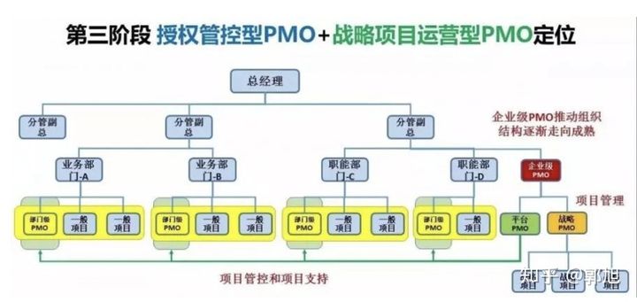 这个时候我们通常建议把普通的项目仍然还放在职能部门底下,但是我们希望要求每一个职能部门底下产生一个PMO的接口,比如产生分部门级的PMO。为什么产生分部门级PMO呢?一方面可以有利于这个部门级的PMO,相当于帮助各个部门去分担一下多项目运营管理的工作;第二方面大家知道在部门内部还是自己部门的人管自己部门的人比较容易,尤其当我们开始对项目进行管控的时候,与其PMO直接管,还不如在部门里面找一个人对部门内部进行管理,同时让这个人再去跟PMO进行对接。所以这个时候部门级的PMO就成了一个过渡角色。这个过渡角色一方面又可以跟企业级的PMO进行对接,去承接它的工作跟要求,进行有效地沟通。另外一方面因为跟其它的项目经理都归一个老大管,又比较容易搞定自己部门的人,所以在这个时候他就变成了一个纽带。所以这是在第三阶段解决的一个问题,我们叫授权管控型PMO。什么叫授权管控呢,PMO不直接管控各部门的项目,而是授权这个部门里面一个分子PMO去对它进行管控,这相当于也是一种过渡的策略。