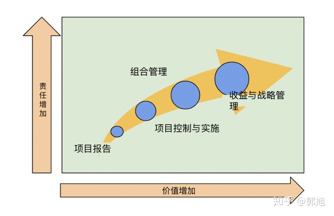 PMO这个部门很特殊 ,它和很传统的职能部门不一样。PMO部门不存在跨组织的相似性及统一性。简单说,每家公司的PMO 做的事情有可能非常不同。不能拿滴滴的PMO来定位知乎的PMO。在 PMO 可做的事情当中,从项目报告到项目控制与实施,到组合管理,再到最后收益与战略管理,PMO 自身的价值是越来越大的,当然责任也随之逐步增加,我们期望随着时间和成熟度的推移,价值和责任同步提升 。随着时间发展,因为组织成熟度和人员项目管理能力培养提升,PMO 自身工作的价值如果不往上走,在企业中会逐步贬值。
