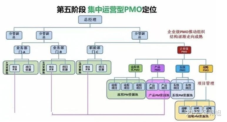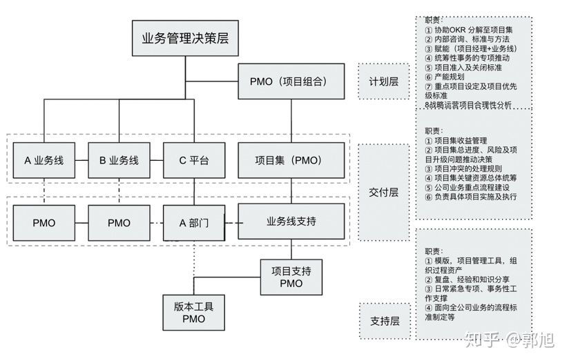 公司对PMO在不同的定位,决定了不同的工作范围和组织上的判断 。但是随着项目管理的层级越高,组织的控制力和执行力就越强。在实际工作中比如,公司业务越来越闭环,如果定位在研发项目管理部,跨业务线项目越来越少,应该裁人。如果定位在PMO,公司业务越来越闭环,组织的控制力和执行力会进一步下降,PMO应该向上提高层级且加人。
