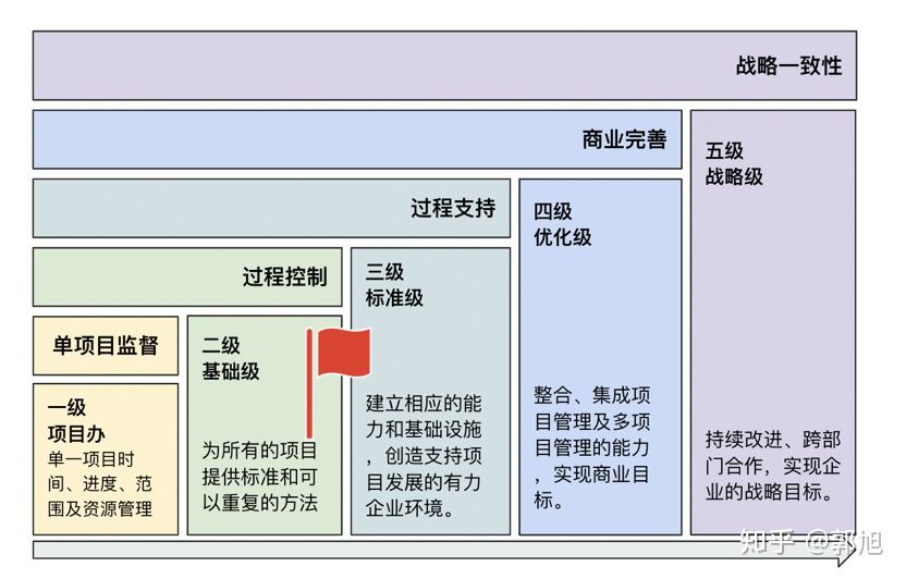 这是一个通用的项目管理成熟度模型。分为五个级别和四个过程组。项目是过程的支撑。在不同发展阶段,企业对于PMO的定位及PMO的工作目标不完全相同。企业的项目管理成熟是一个逐步上升和成长的过程,不能一触而就,需要一段时间的积累。项目管理的的成熟度伴随着企业组织结构演变的步调相一致。但是不是所有企业最后都可以达到五级。有很多企业的PMO 或永远的停留在了某一级。这个部门,如果没有管理层的支持很难活下去。