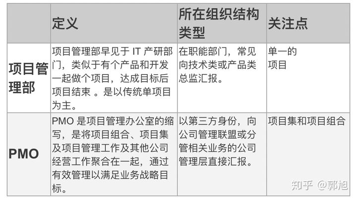 PMO部门,是企业项目管理办公室的缩写。是将项目组合、项目集管理及项目管理及其他公司经营工作聚合在一起,通过有效管理以满足业务的战略目标。PMO和研发项目管理部又有什么关系呢,二者有哪些相似点及区别?我们看下图的对比分析。项目管理部是PMO的雏形,目前在企业中这个部门基本消失。大多叫PMO,但是也有很多只做了项目管理部的事情。在组织结构方面,PMO和研发项目管理部有什么区别?