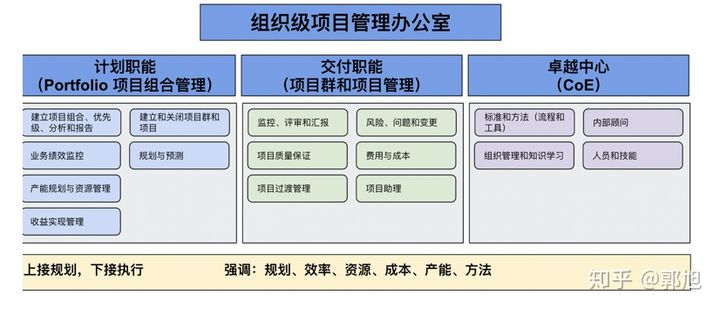 常见的组织级项目管理办公室有如下三种职能:一是计划职能,拆解战略,建立项目组合、优先级,产出分析和报告。业务绩效监控,规划公司的产能与资源。对所有的收益实现管理,建立和关闭项目群及项目,规划与预测。在将付职能中,主要是负责项目集和项目管理。在质量,进度,成本,费用,风险等进行全方位的管控,以使资源结束下,收益最大。在COE也就是支持这部分,主要是做项目管理内部的知识沉淀,项目复盘,项目的一些制度方法和流程,人员和技能的培训提高等。