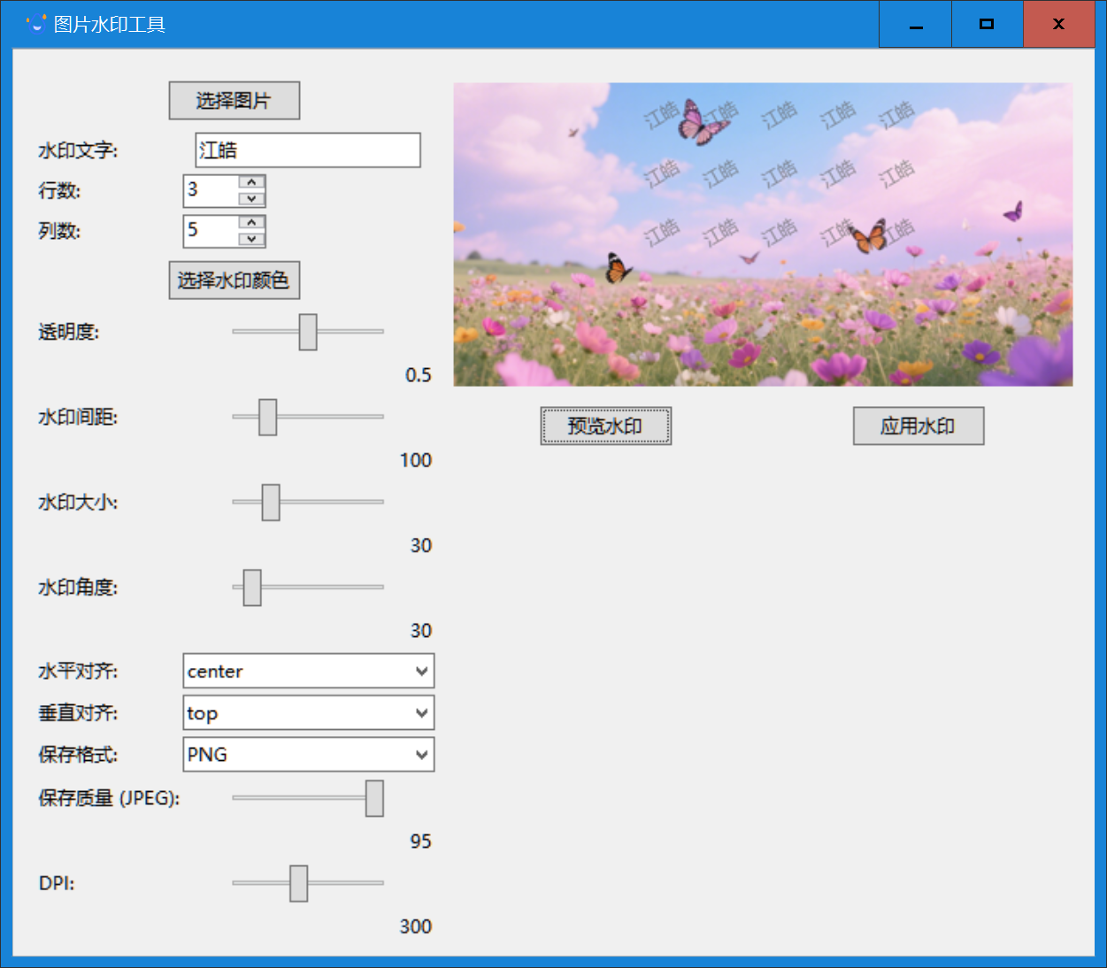 其功能表现十分灵活,可自定义水印的透明度、间距、尺寸与旋转角度,同时支持保存路径的自主选择。