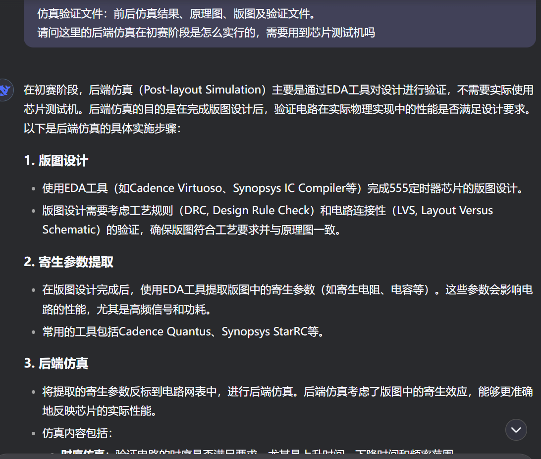 个人建议,大一打集创赛最好不要抱着拿奖的希望,特别是模拟赛道。 代码,硬件有关的赛道很多时候每个学校都有祖传的代码,设计之类的,但是模拟方面,很少有祖传的版图电路图之类的东西可以流传,而且模拟赛道需要很多经验的积累以及各种指导,AI不可能给你画电路图或者版图的指导建议的。