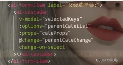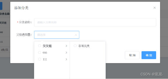 由于最细添加的是三级分类(或者添加一级、二级分类),因此级联选择器只用展示一、二级的父类,请求分类接口,type=2 value / v-model: 选中项绑定值,是一个数组 级联选择器的handleChange方法,能获取到最接近一层的父类参数分类id,配置级别和分类名称,组成一个obj作为参数发POST请求