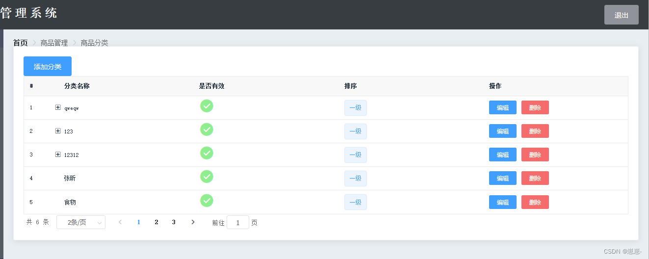 表格样式:树形结构 +【是否有效】【级别】【操作】字段; 组件选择:由于第一列的el-table-column要展示为树形结构,因此使用组件element-tree-grid,all props of el-table-column are supported; 在获取到三级商品分类后,element-tree-grid只需要绑定好对应的属性,即可显示。
