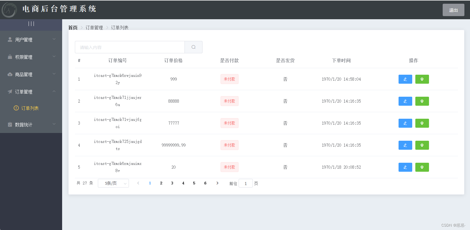 这个项目大致分为了:登录,退出登录,用户管理,权限管理,商品管理,订单管理,数据统计7部分