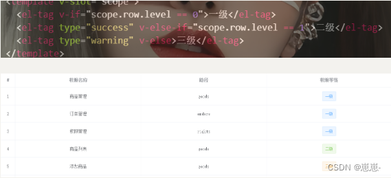 <el-table :data="list" border style="width: 100%"> <el-table-column type="index" label="#" align="center"></el-table-column> <el-table-column prop="authName" label="权限名称" align="center"> </el-table-column> <el-table-column prop="path" label="路径" align="center"> </el-table-column> <el-table-column label="权限等级" align="center"> <template v-slot="scope"> <el-tag v-if="scope.row.level == 0">一级</el-tag> <el-tag type="success" v-else-if="scope.row.level == 1">二级</el-tag> <el-tag type="warning" v-else>三级</el-tag> </template> </el-table-column> </el-table>