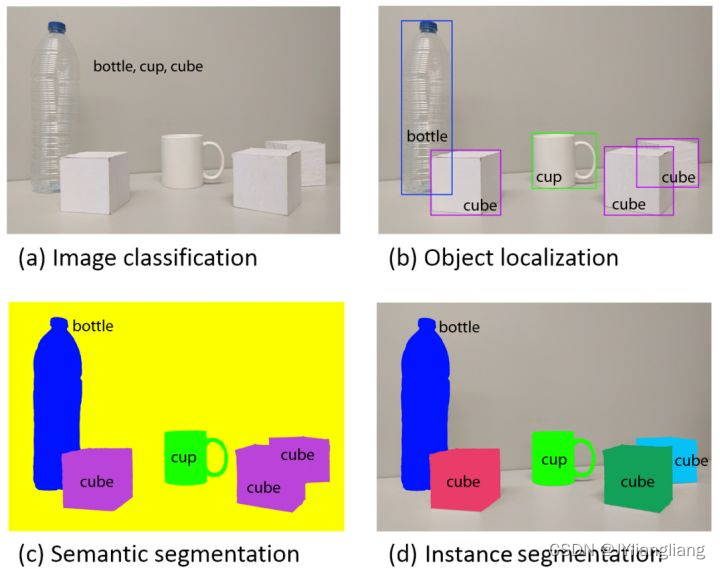 - 实例分割(目标分割和目标识别):定位图中每个物体,并进行像素级标注,区分不同个体;(CUBE都是不同颜色)