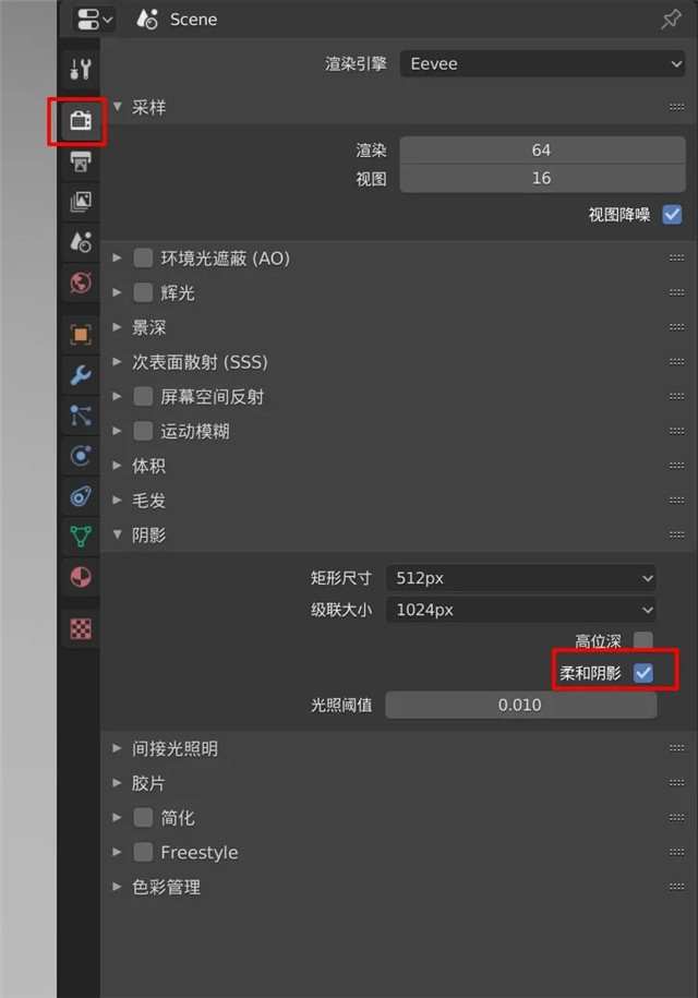 打开柔和阴影后,边缘已经被柔化了。并且我们可以在渲染设置里,把采样值里的视图参数调高,默认是16,可以适当调整高一些,这也影响阴影呈现的效果。