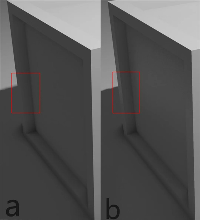a是没有勾上环境光遮蔽也就是AO,显然缺乏层次感,并且缺乏我们大脑潜意识所能感知的深度部分。b勾上环境光遮蔽后,其效果在场景的角落或缝隙中是最明显的。