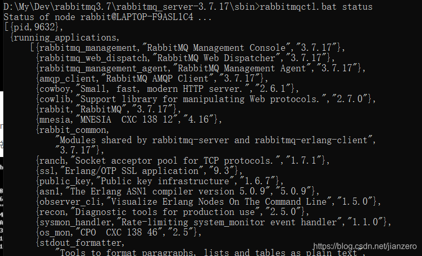 (2) rabbitmqctl.bat status命令可以查看rabbitmq状态,若显示如下信息,说明rabbitmq server已启动