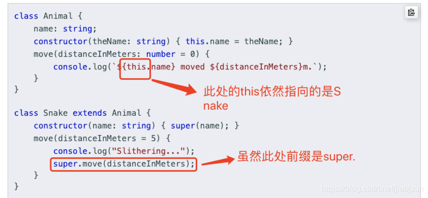 Dog是一个 派生类,它派生自Animal基类,通过extends关键字。 派生类通常被称作 子类,基类通常被称作 超类。因为