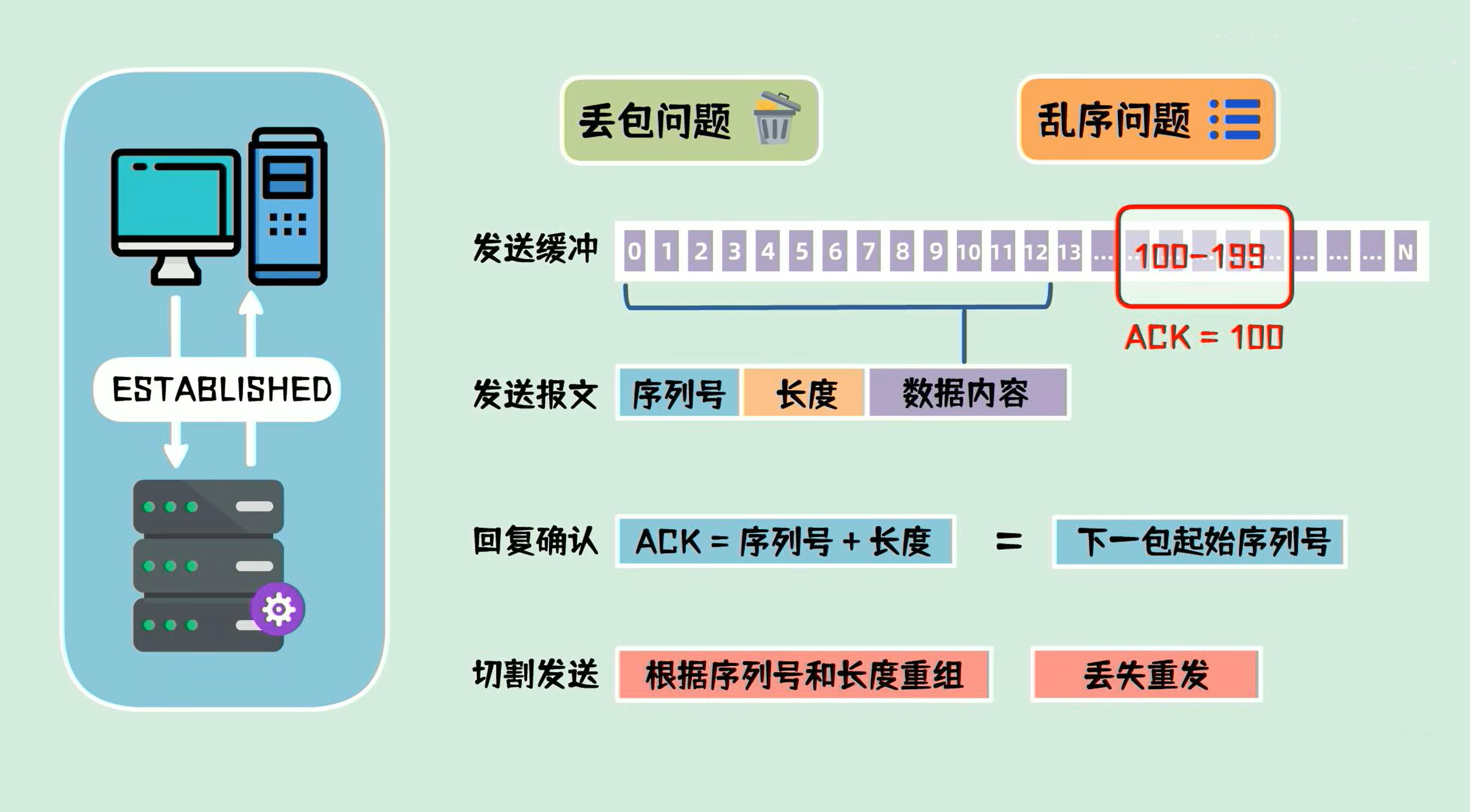 这样发送端可以把待发送的数据,分割成一系列的碎片,发送给接收端,接收端根据序列号和长度,在接收后,重构出来完整的数据;发送端也可以发送连续的多包数据,接收端只需要回复一次ack就可以了。