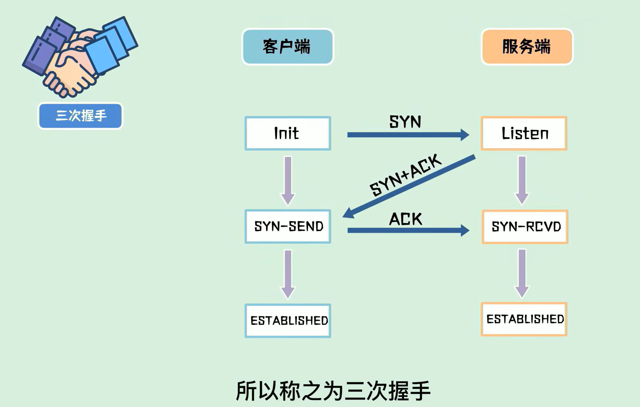 为什么两次握手不行:为了防止已失效的报文,突然又传到服务器端引起错误,比如当客户端发送syn包时,由于网络不稳定,syn在中间滞留,客户端会再发送一次syn包,这次正常到达了