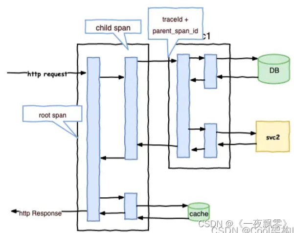 在外界对微服务进行一个请求开始进入我们的微服务体系时,会生成一个Root Span,当web服务去调用后面的服务svc1时又会生成一个span,调用DB也会生成一个span,每一个应用调度都会生成一个新的span,这个是span是整个调用链形成的关键,span中有一些关键的信息,有traceId,spanId。RootSpan是比较特殊的,在启动的时候会生成spanId还会生成TraceId,其他的span会生成自己的spanId,为了维护好调用链上下文的调用关系,span会去记录调用它的链路,以parent spanId记录下来,这样的话父子之间的关系就可以记录下来,每个调用都会把第一个链路traceId也记录下来,这样,当我们把这些span都存在起来,就可以通过分析手段,把整个调用链的关系还原出来。