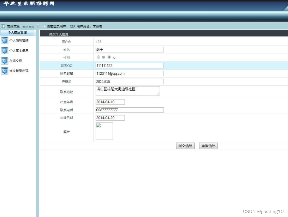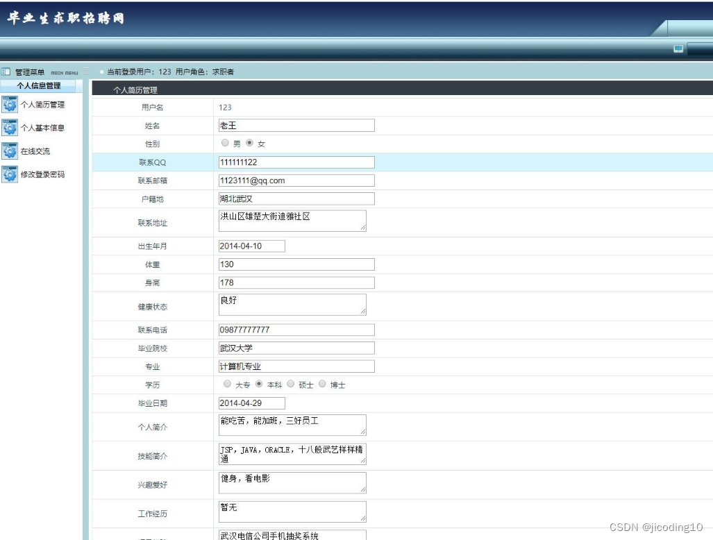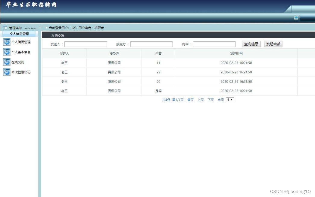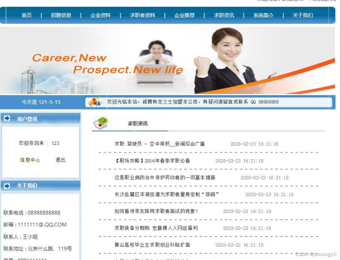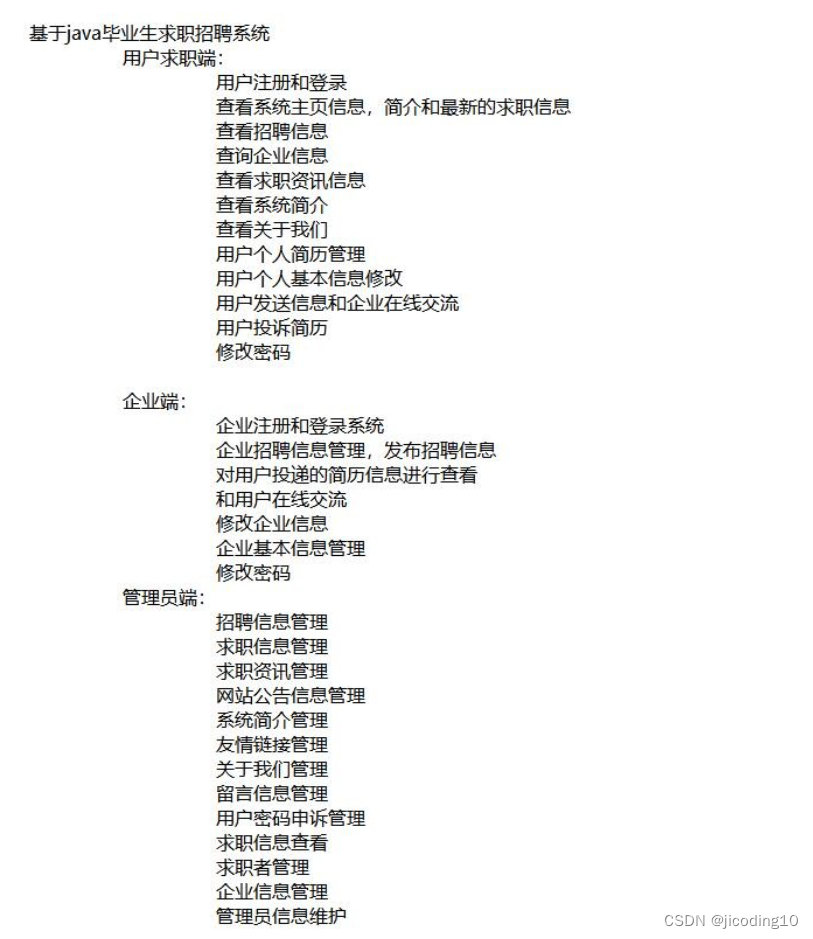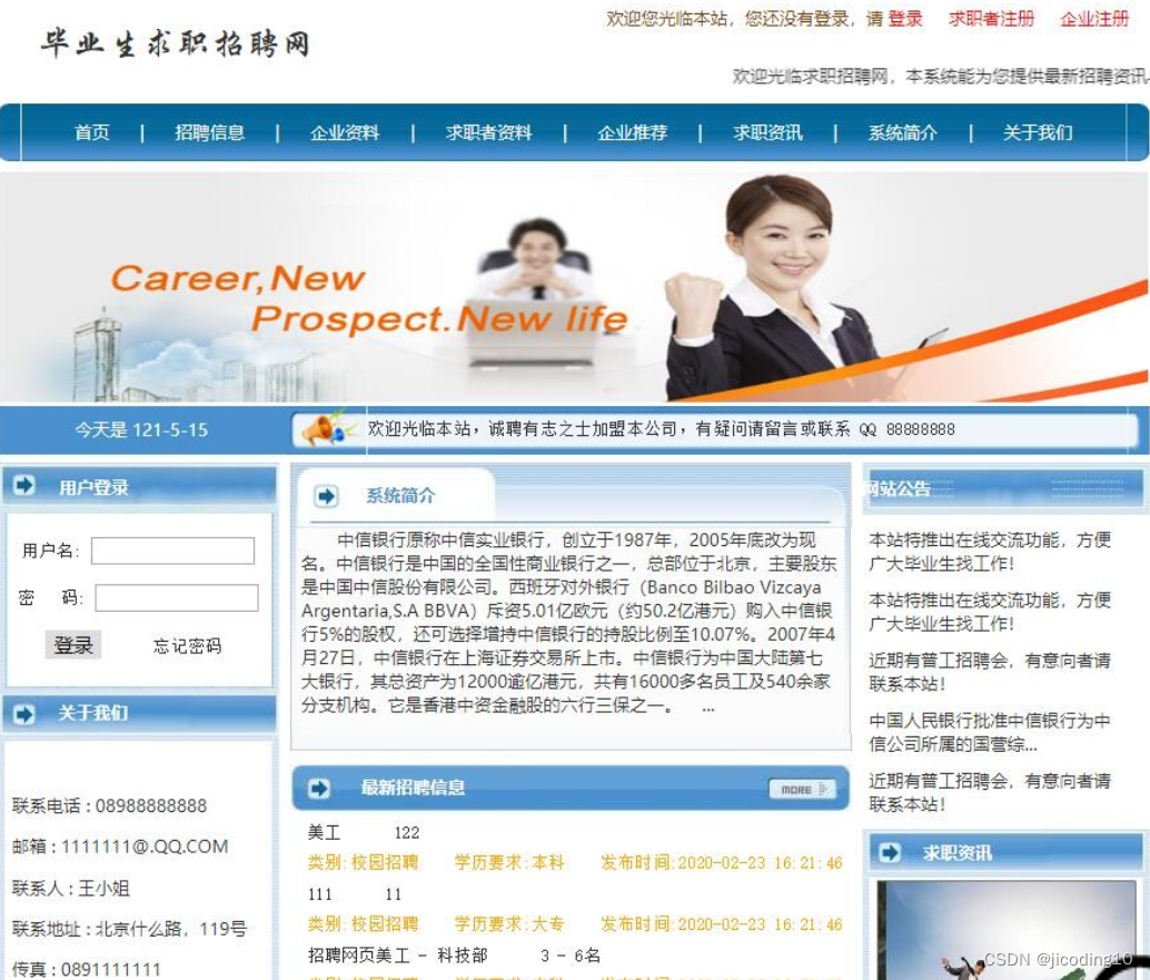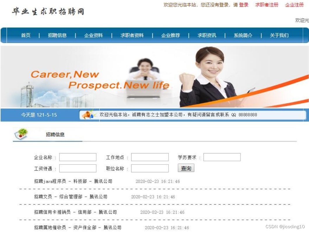 毕业生求职招聘系统,本系统适用于毕业设计和课程设计,系统主要分为毕业生,招聘企业,管理员三个角色,其中用户毕业生功能主要有,登录,注册,查看公司招聘信息,个人基本信息,求职意向,联系方式,查看招聘信息,招聘企业主要功能有:管理招聘信息,注册企业用户,企业职位信息管理,管理员主要功能有:企业管理,毕业生管理,网站管理,个人管理