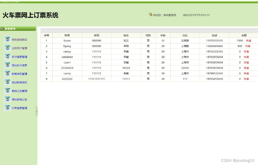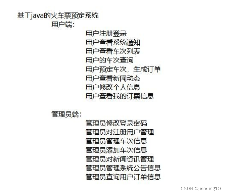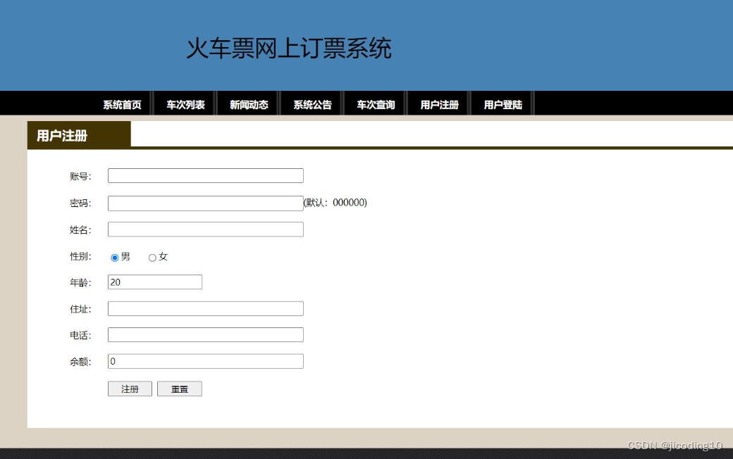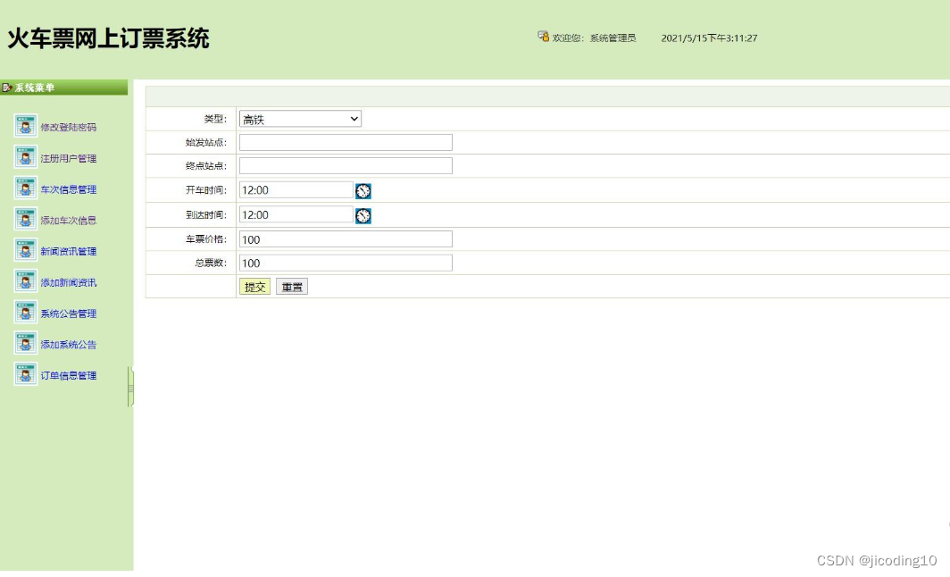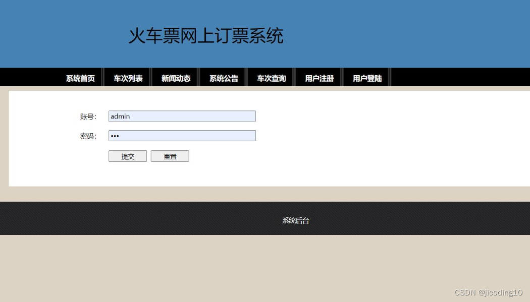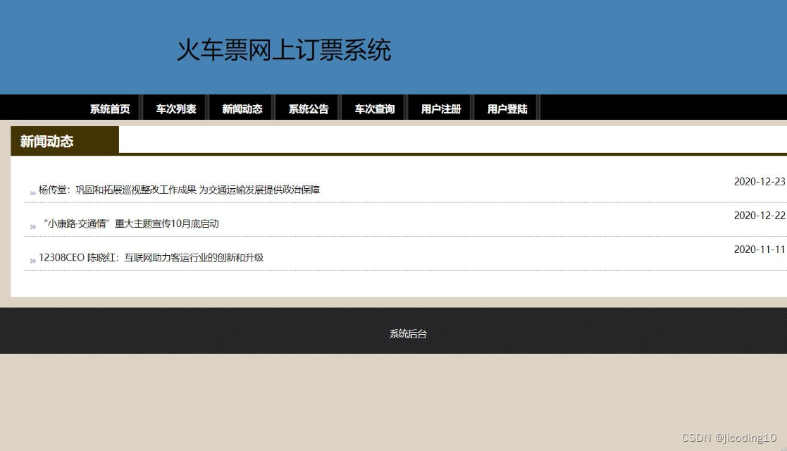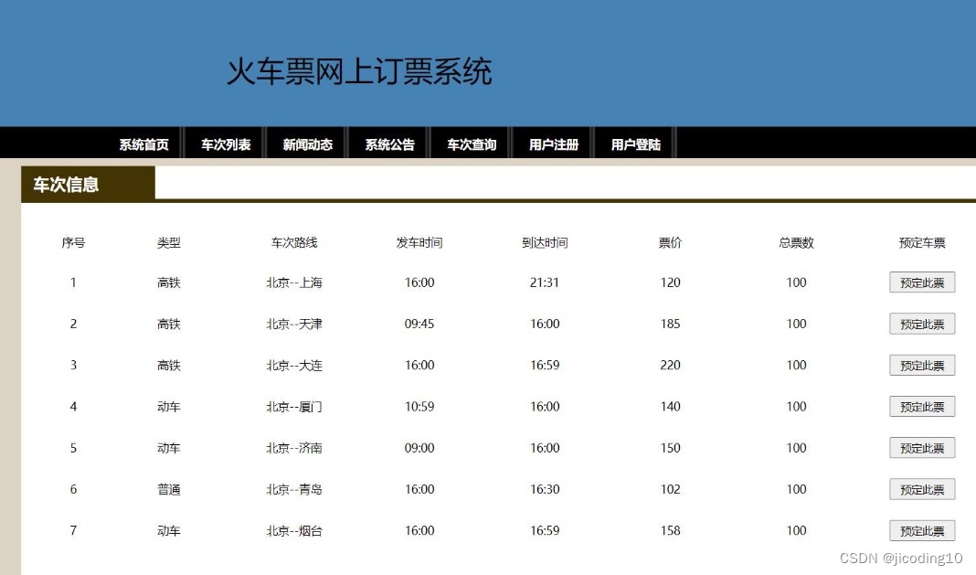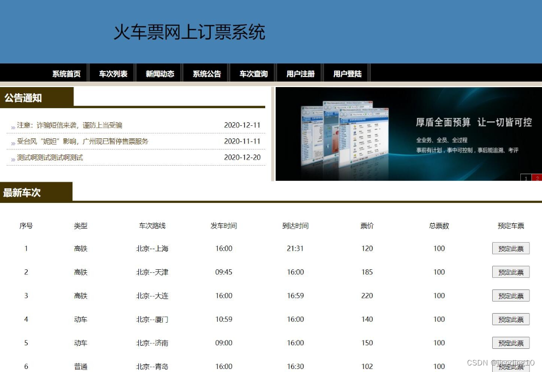 此设计适合用于毕业设计和课程设计,带论文,基于java语言和mysql开发的系统,主要的功能如下:用户注册登录,用户查看车次列表,查看新闻动态,查看系统公告,查询车次,预定车票,下订单,管理员管理新闻,车次,查看用户订单等功能