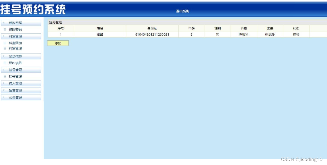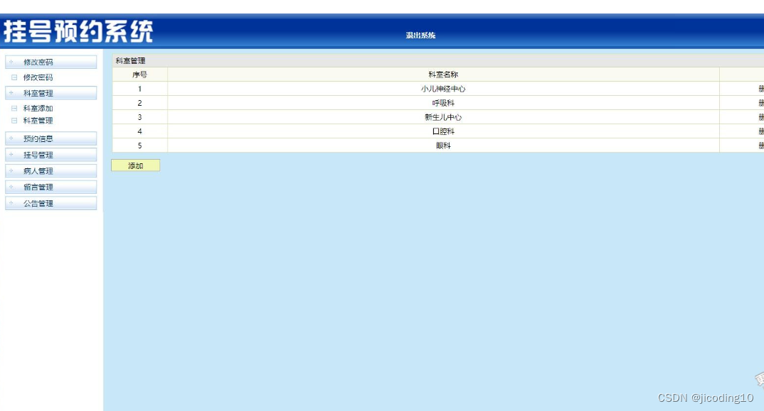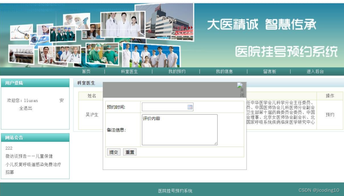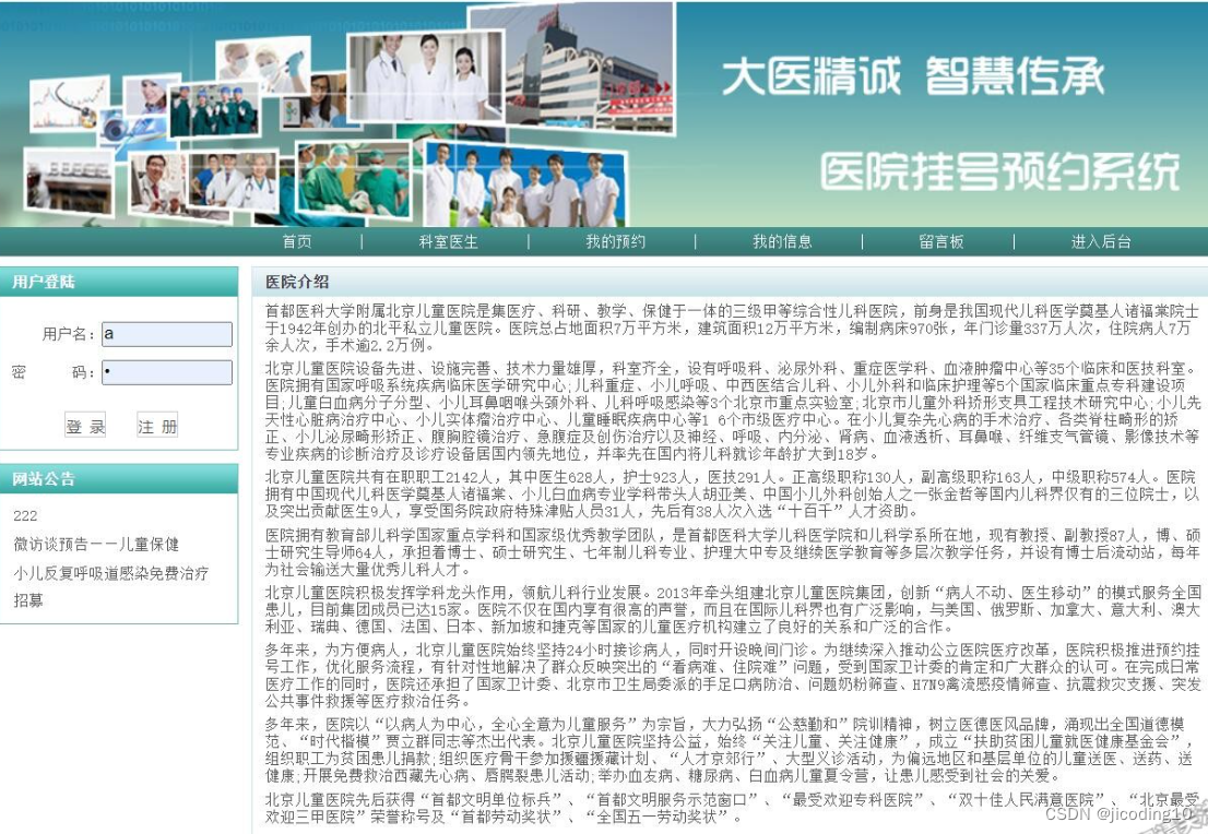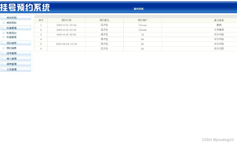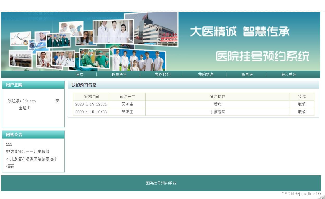 医院挂号预约系统,本系统适用于毕业设计和课程设计,系统主要分为用户和管理员两个角色,其中用户功能主要有,登录,注册,查看科室医生,查看我的预约,我的信息,在线留言。管理员的主要功能有:科室管理,预约管理,挂号管理,病人管理,留言管理,公告管理等。