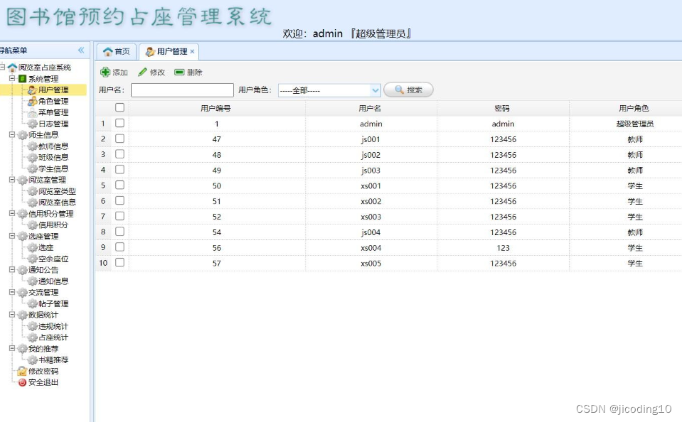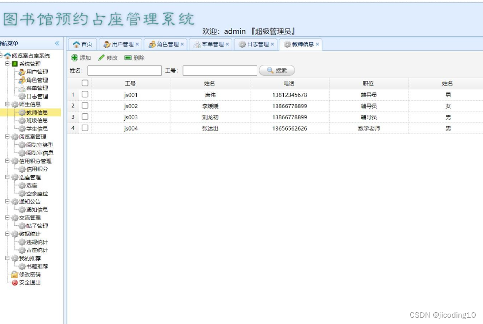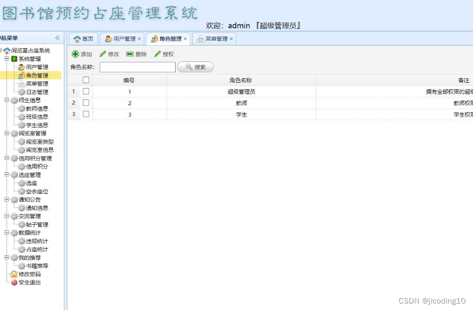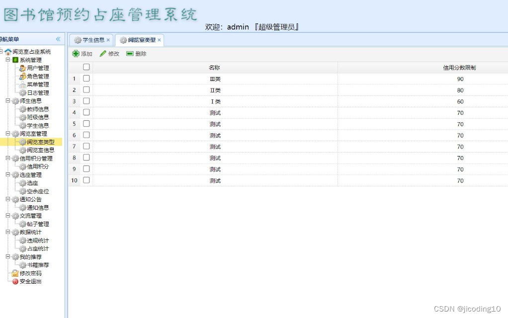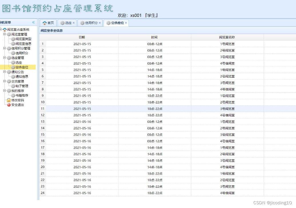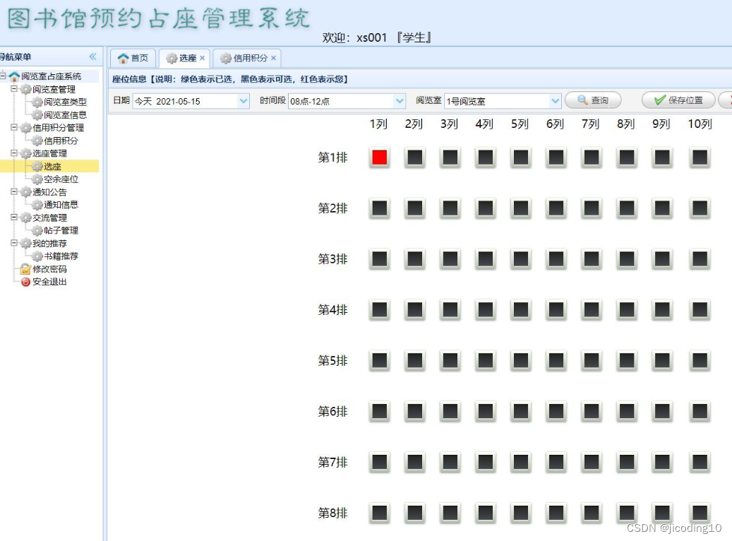 该适用于毕业设计和课程设计,由jsp+ssm+mysql实现,前端采用的是当下最流行的easyui框架,后台用的ssm(spring、springMVC、mybaits)框架,主要实现的功能有:用户管理、菜单管理、角色管理、权限管理、学生管理、教师管理、班级管理、图书馆阅览室管理、学生信用管理、预约占座管理、发帖评论管理、违规统计、占座预约统计等,添加学生和教师时会自动在用户表中注册,定时任务会定时生成座位信息,阅览室分类中可设置信用等级,学生被扣分后信用等级低于相应的值后不能预约相应的阅览室座位。
