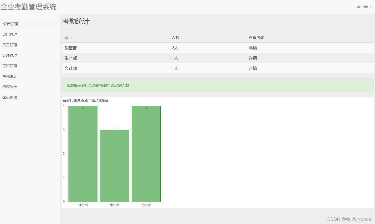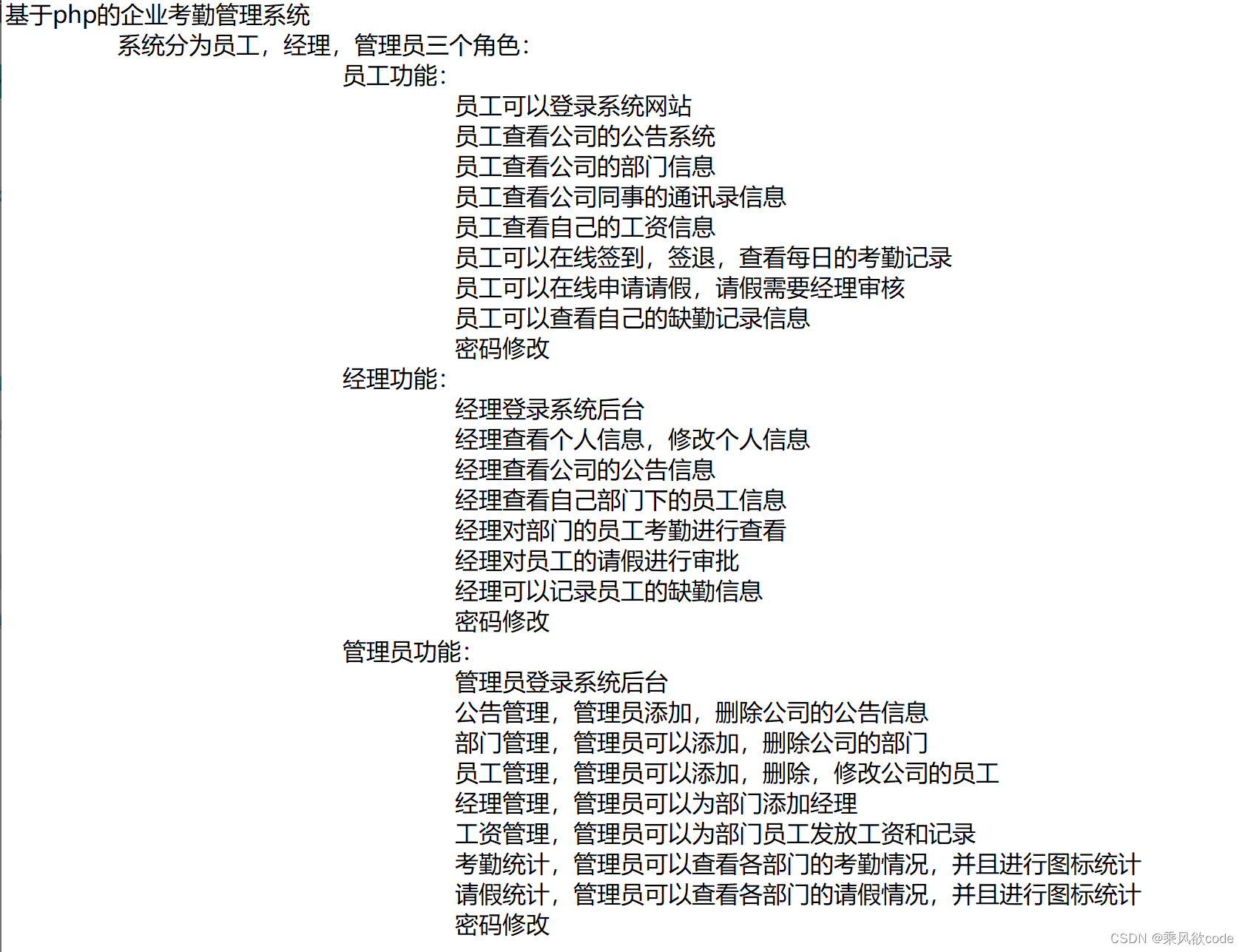 本设计采用php编程语言和mysql数据库进行开发的一个企业考勤管理系统,系统分为三个角色分别为员工,管理员,经理,员工的主要功能是签到,签退,在线请假申请,查看缺勤记录;经理的主要功能有,对员工的请假进行审批,查看缺勤信息;管理员是对公告信息,部门信息,工资信息,进行管理。本设计采用php原生技术开发,简单易懂,注释全面,可作为php毕业设计和课程设计参考和学习。