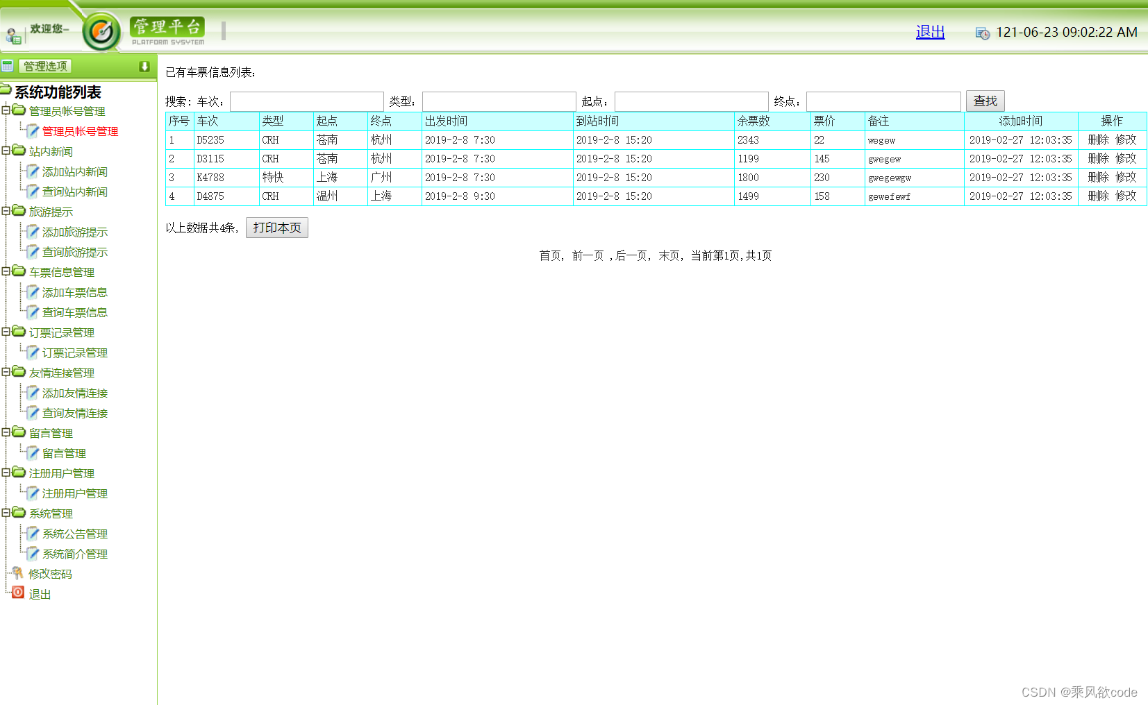 毕设云-基于php的火车票预定管理系统-管理员查看车次