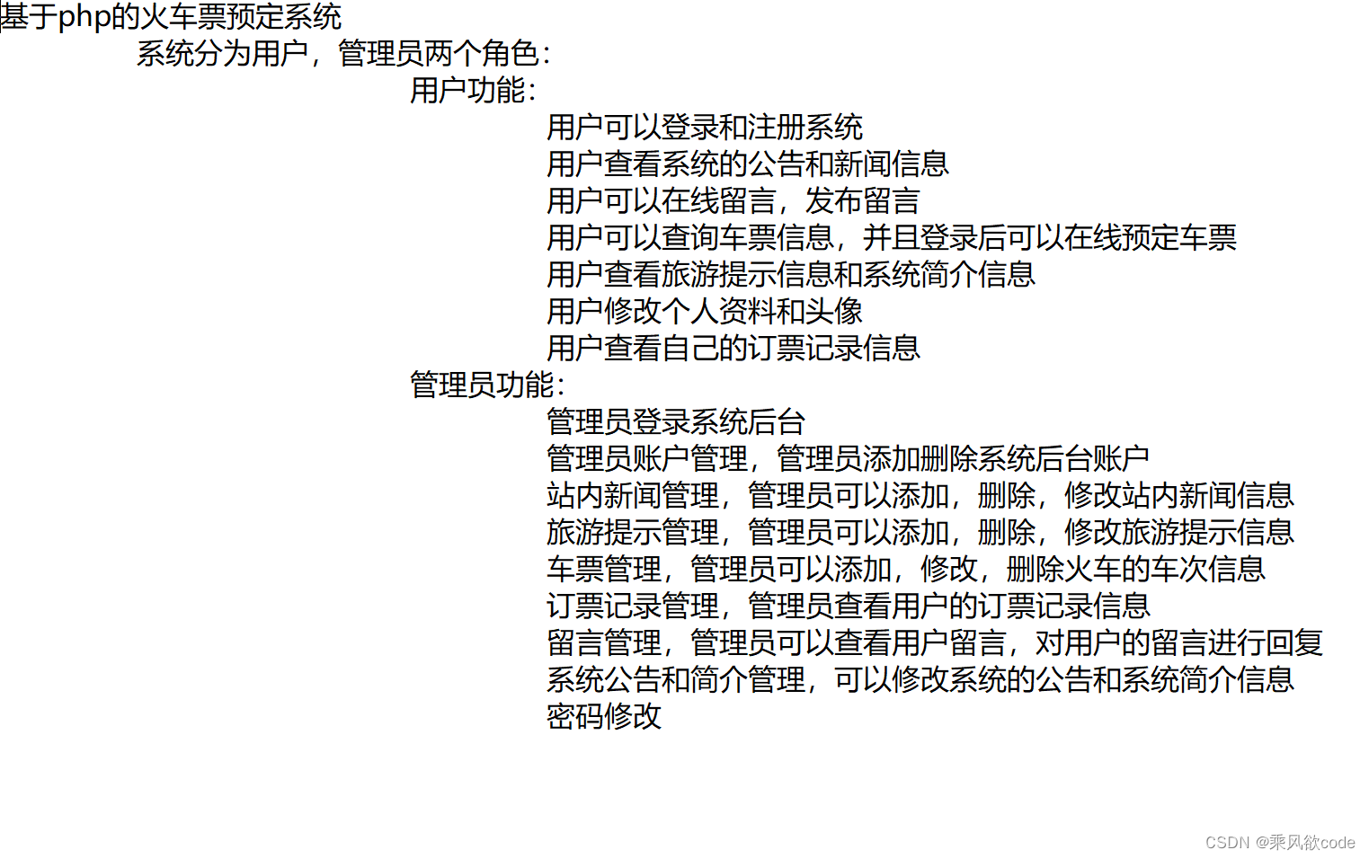 本设计采用php编程语言和mysql数据库开发的一个火车票预定管理系统,系统主要功能有用户登录系统,查看系统的相关公告,通知,查询票务,在线预定车票,管理员则是对系统的公告,简介,车次,用户等进行相关的管理,本设计采用了php原生开发,结构简介,适合用来作为php毕业设计和php课程设计参考和学习。