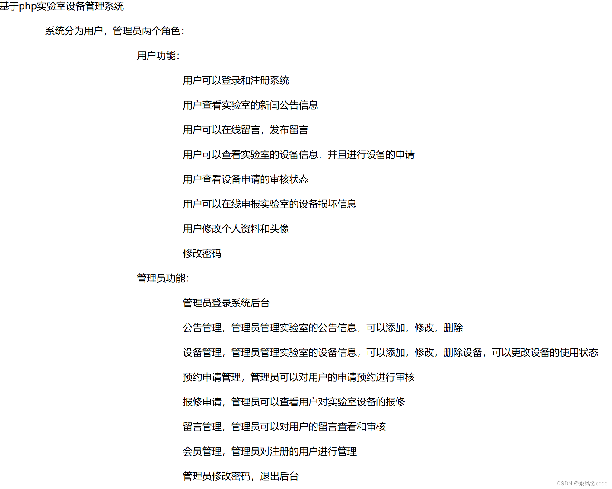 本文提供了一款基于PHP的实验室设备管理系统,适用于毕业设计或课程设计。系统包括用户和管理员角色,具备设备查看、预定、报修等功能。支持PHP 5.3以上,使用HTML、CSS、JS、PHP、MySQL和PhpStudy技术,前端采用bootstrap框架。项目包含源码、安装教程、数据库和环境配置。