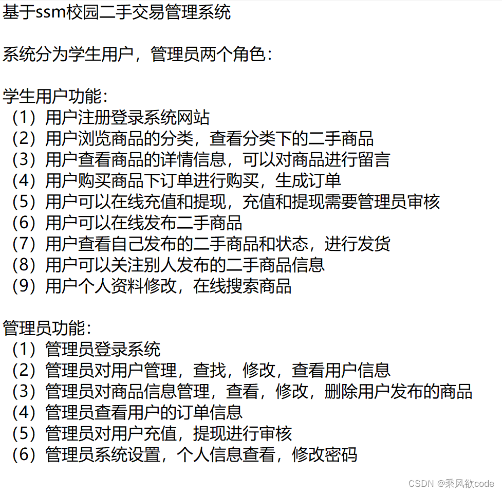 校园二手交易网站管理系统是基于java编程语言,ssm框架和mysql数据库开发,BS架构系统。系统主要分为学生用户,管理员两个角色,学生可以浏览商品,购买二手商品,留言和关注,发布二手商品;管理员则是对商品,订单,用户等信息进行管理。本系统功能齐全,注释清晰,适合作为java毕业设计和java课程设计来参考和学习。
