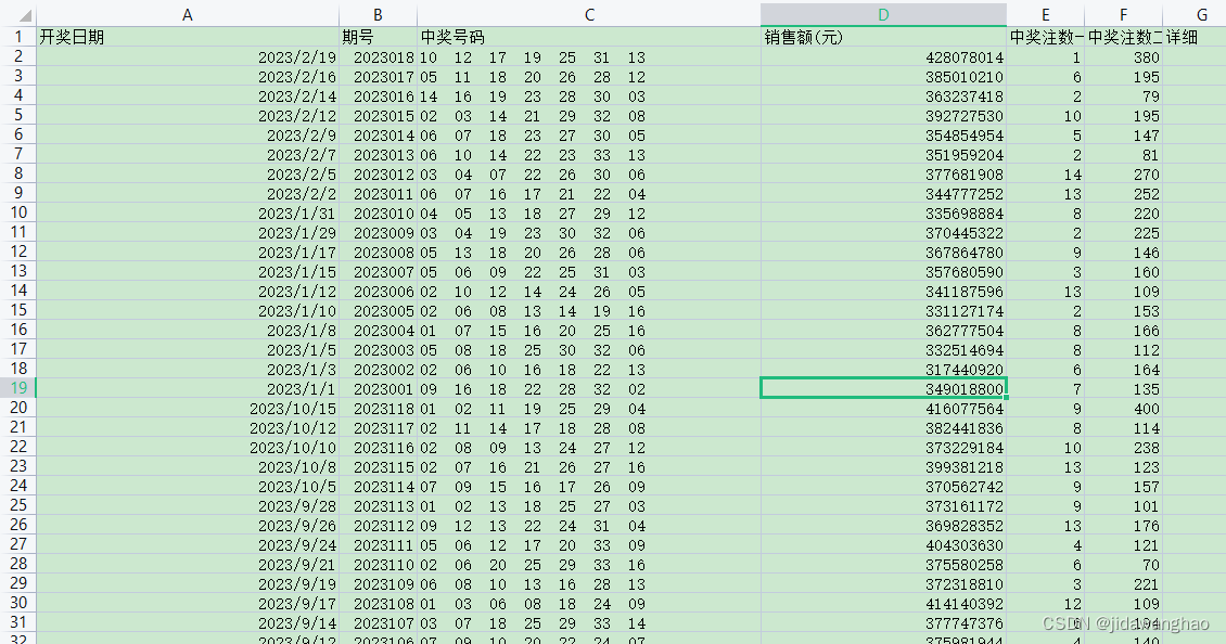 csv.writer(f).writerow(['开奖日期', '期号', '中奖号码', '销售额(元)', '中奖注数一等奖', '中奖注数二等奖', '详细'])