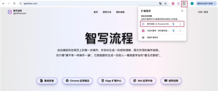 - 插件安装完成后,点击浏览器右上角的「智写流程」图标;