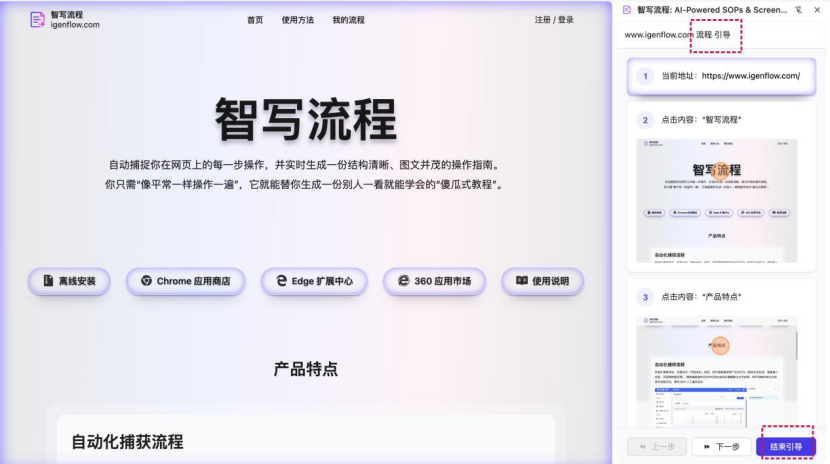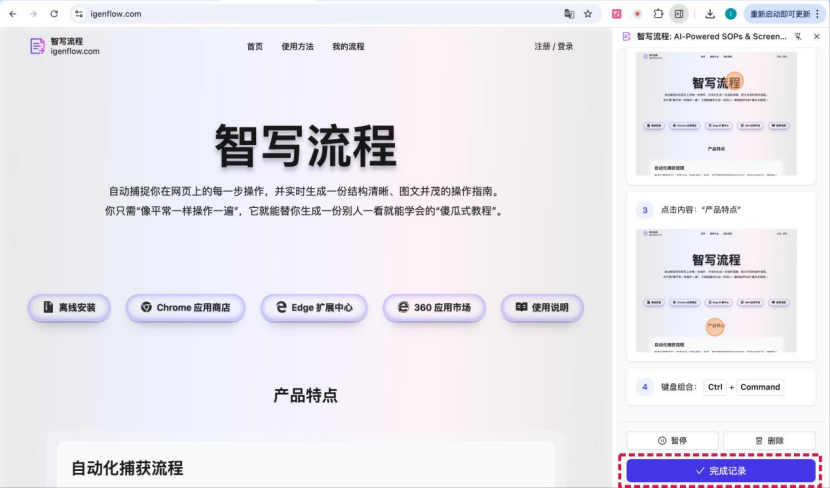 - 操作结束后,点击「完成记录」,系统将自动生成包含截图和文字说明的操作指南。