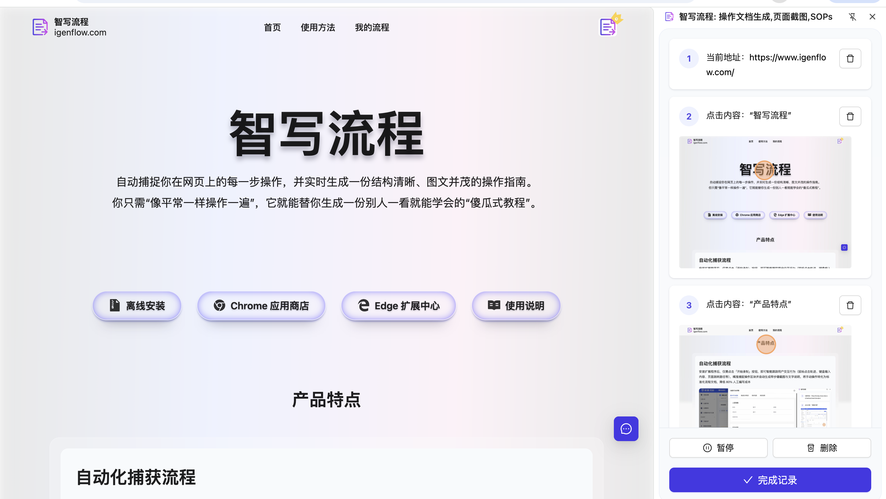 智写流程是一款专注于网页操作记录的工具,它能自动捕捉你在网页上的每一步操作(如点击、输入、页面跳转等),并实时生成结构清晰、图文并茂的操作指南。
