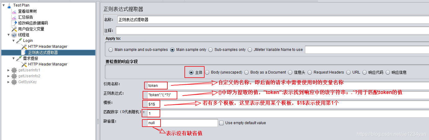 上图中Login接口的Response中有用户token,该token需要在下一个需求提报的接口中使用,所以在Login下添加“正则表达式提取器”